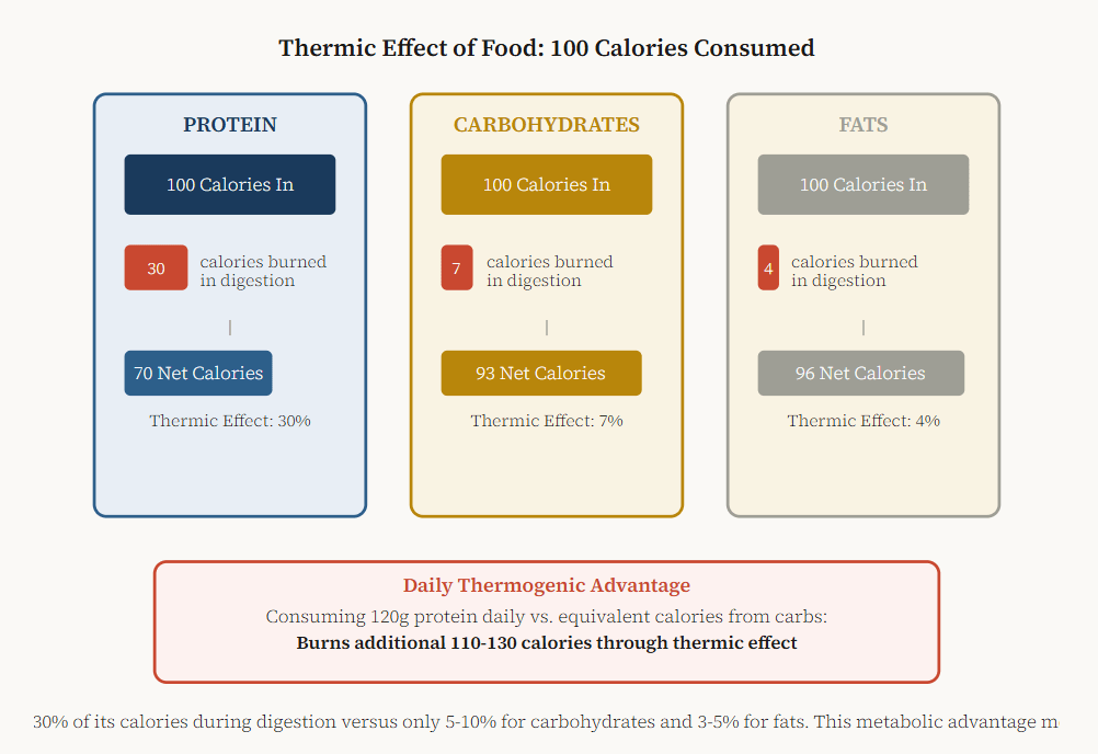 A 150-pound person consuming 100 grams of protein daily burns an additional 100-120 calories through thermic effect compared to consuming equivalent calories from carbohydrates or fats.